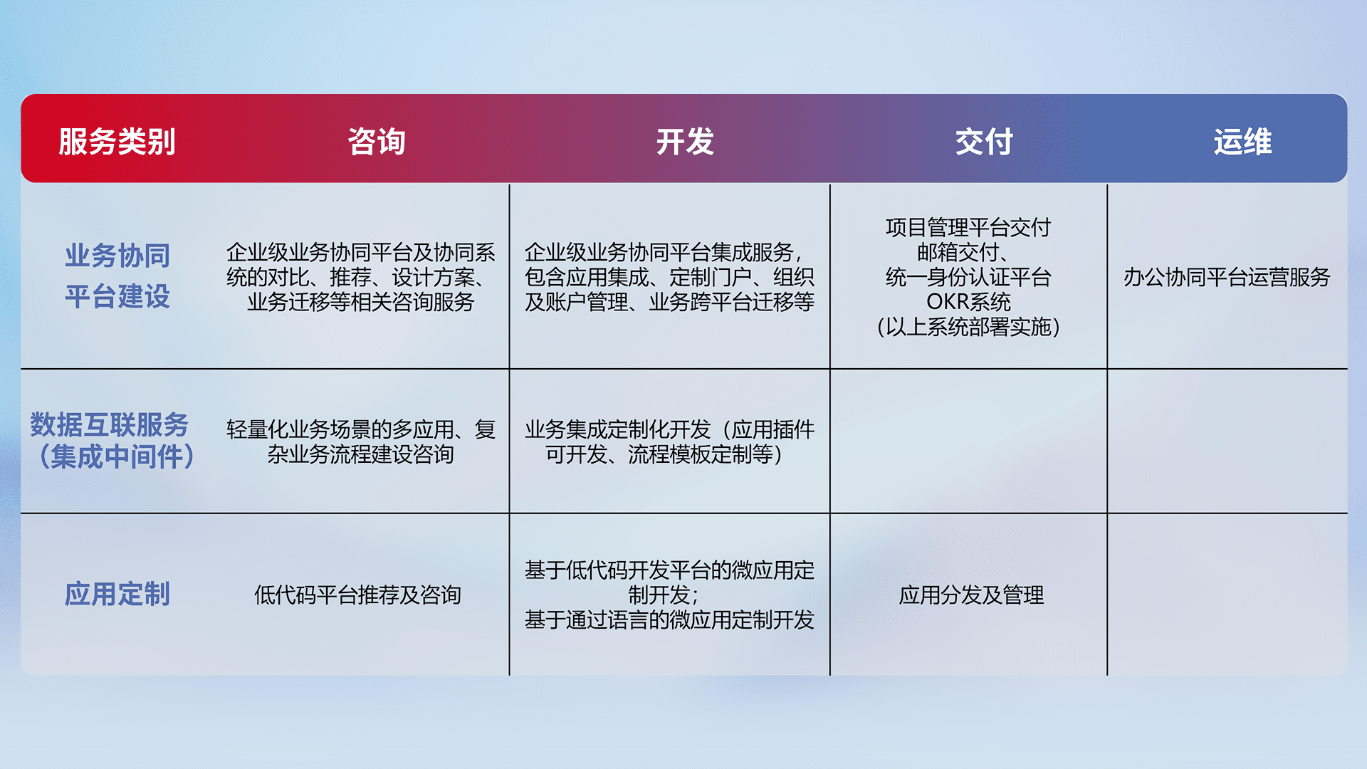 针对钉钉、、企微、、、IDaas等平台级产品提供产品的规划、、方案、、、交付、、、定制化开发等服务,,,,实现如统一协同办公、、、智能客户服务、、、混合会议管理、、、、智能数据查询、、等业务场景,,,实现数字化转型。。